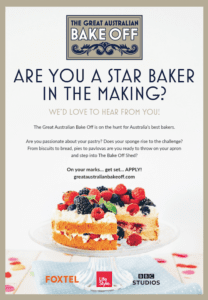 CASTING NOW * THE GREAT AUSTRALIAN BAKE OFF * We’re looking for Australia’s best home bakers! Don’t be shy, put yourself forward or tag star bakers that you know. CASTING will close soon so don’t miss out. APPLY NOW
